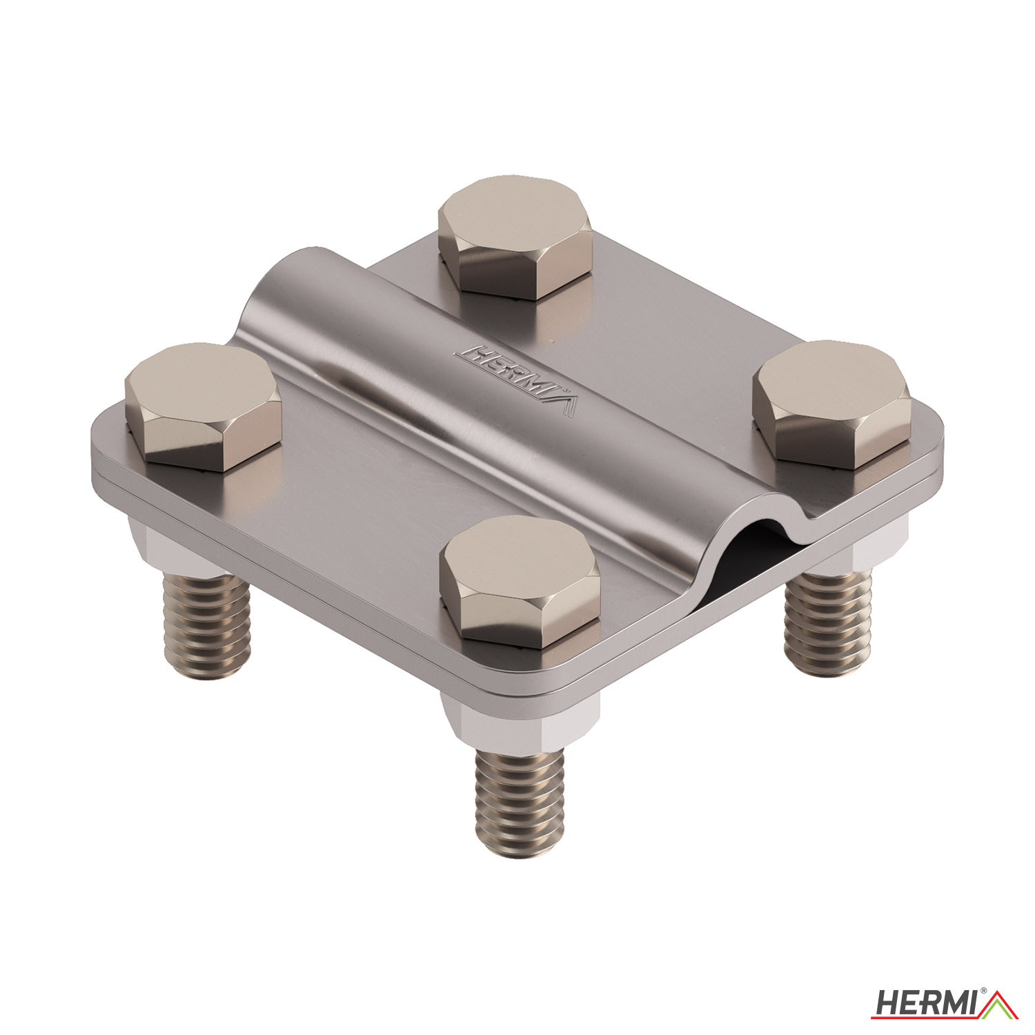 KON02 keresztkapocs, amely 2 db 58 mm x 58 mm-es lemezből és 4 db  M8-as csavarból és anyából áll. Mérési és egyéb kötések elvégzésére szolgál a talajban és felette. 8-10mm-es kerek és legfeljebb 30 mm széles laposvezető összekötésére szolgál.