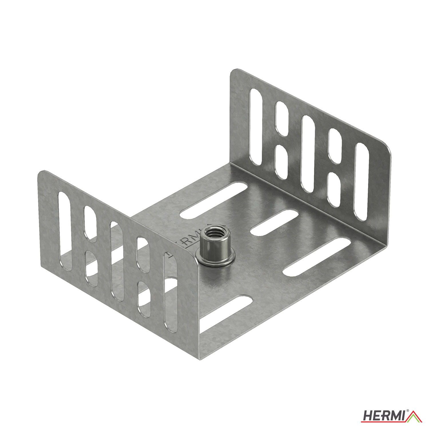 A függesztő konzol kábeltálcák mennyezetre történő rögzítésére szolgál. A konzolt magába a kábeltálcába helyezzük és az M8 menetes rúd segítségével a tetőre rögzítjük. A konzolok közötti ajánlott távolságot a terhelési diagram alapján határozzuk meg. Rögzítéséhez tálcacsavar ajánlott.