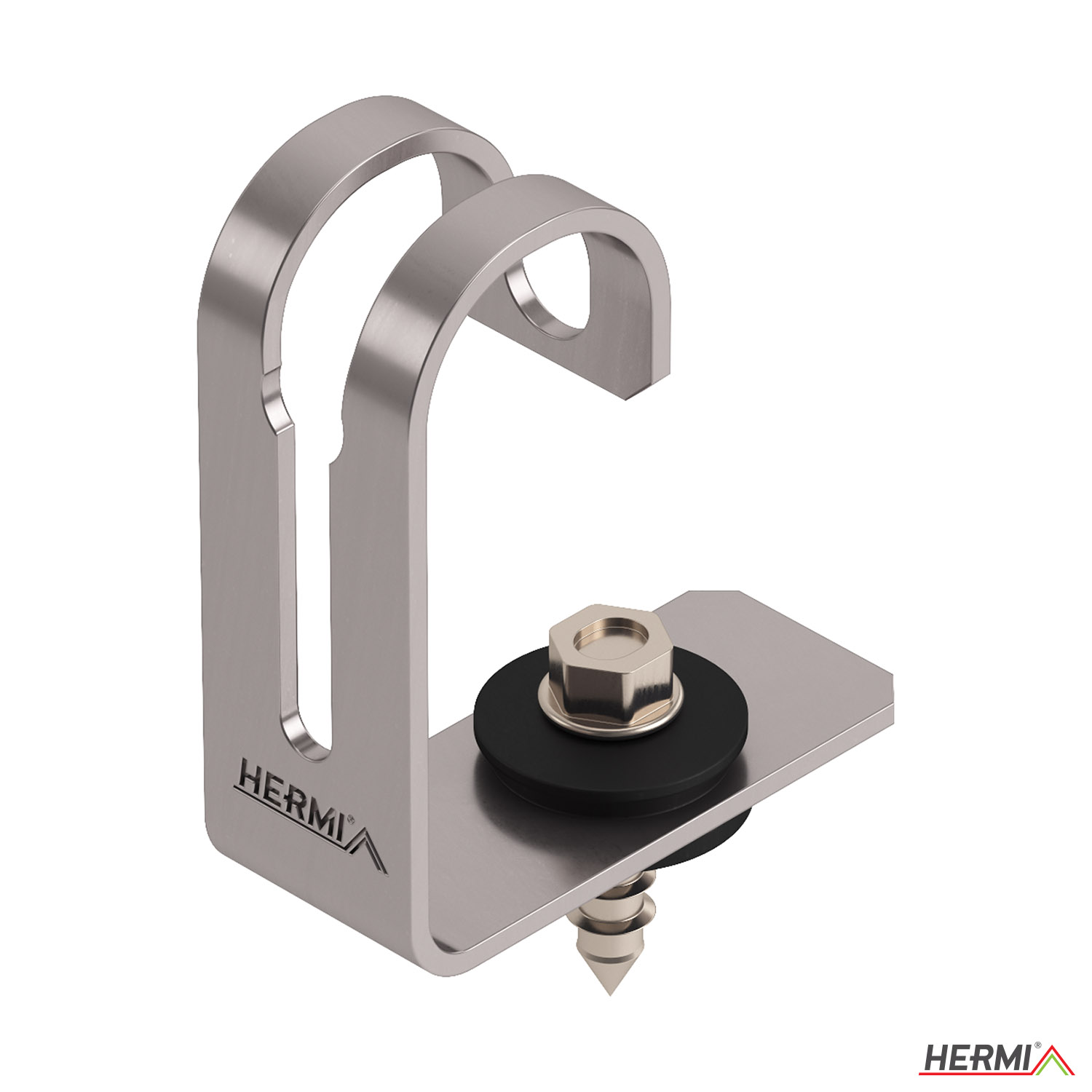 A Hermi 11621 cikkszámú termék a SON16 Rf-K 8 mm típusú tetővezeték-tartó, amelyet kifejezetten fémlemez (például TRIMO) és fibrocement (például SALONIT VALOVITKA) tetőfedéseken történő villámvédelmi vezetékek rögzítésére terveztek.