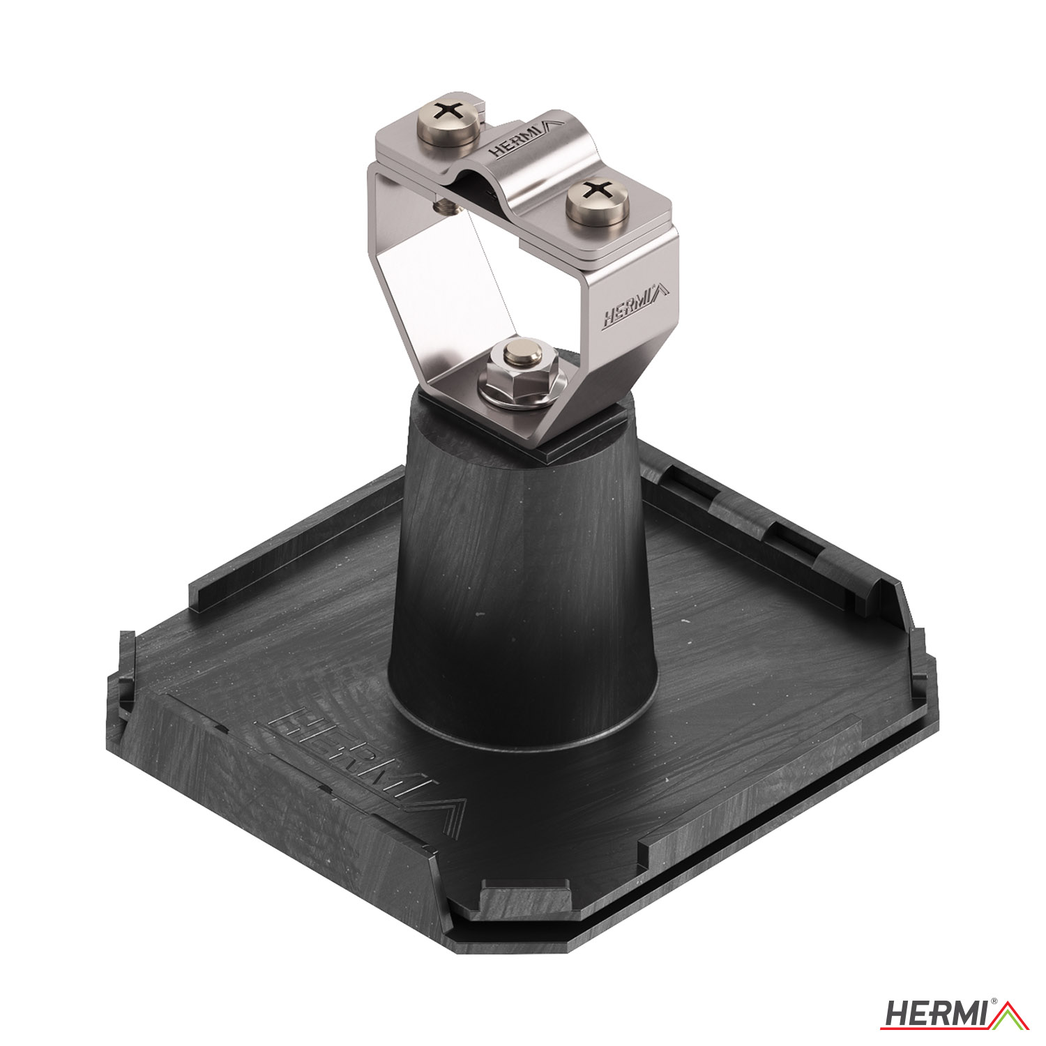 A Hermi 117236 cikkszámú termék a SON17 A RF 8–10 mm típusú tetővezeték-tartó, amelyet lapostetők villámvédelmi rendszereinek rögzítésére terveztek. Ez a tartóelem kifejezetten PVC bevonatú tetőfedésekhez, például SIKA, PROTAN, SARNAFIL és SINTAFOIL típusú anyagokhoz alkalmas. A tartóelem rozsdamentes acélból készült, és csavarozható rögzítéssel rendelkezik, míg a vezeték rögzítése kattintásos bilincsel történik. A tartóelem műanyagból készült, és 8–10 mm átmérőjű vezetékekhez használható.