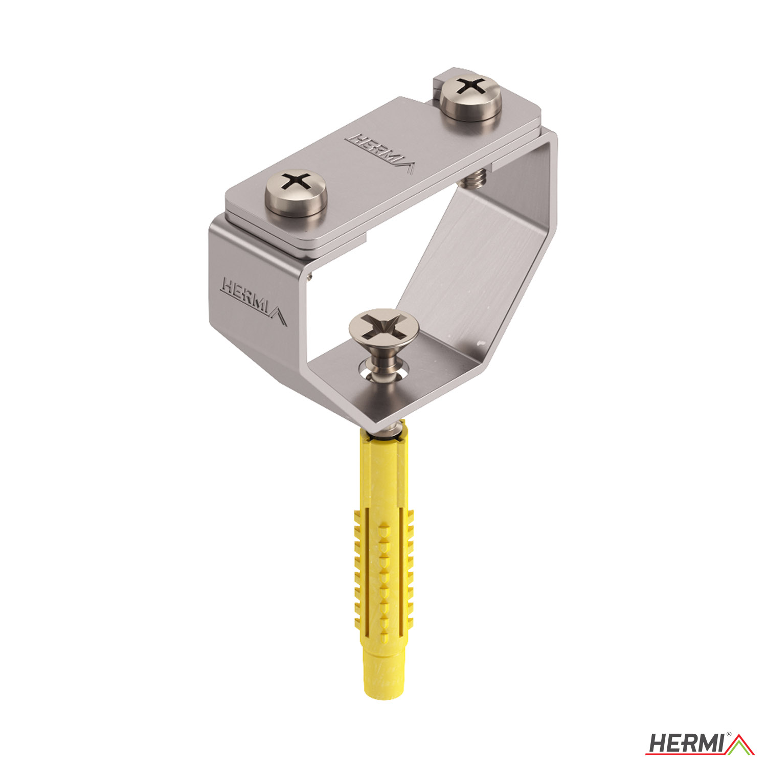 A rozsdamentes acélból készült ZON03 fali vezetőtartó 50 mm-es csavarral és tiplivel tömör falakhoz, a vezeték a rögzítőhöz csavarozva van.