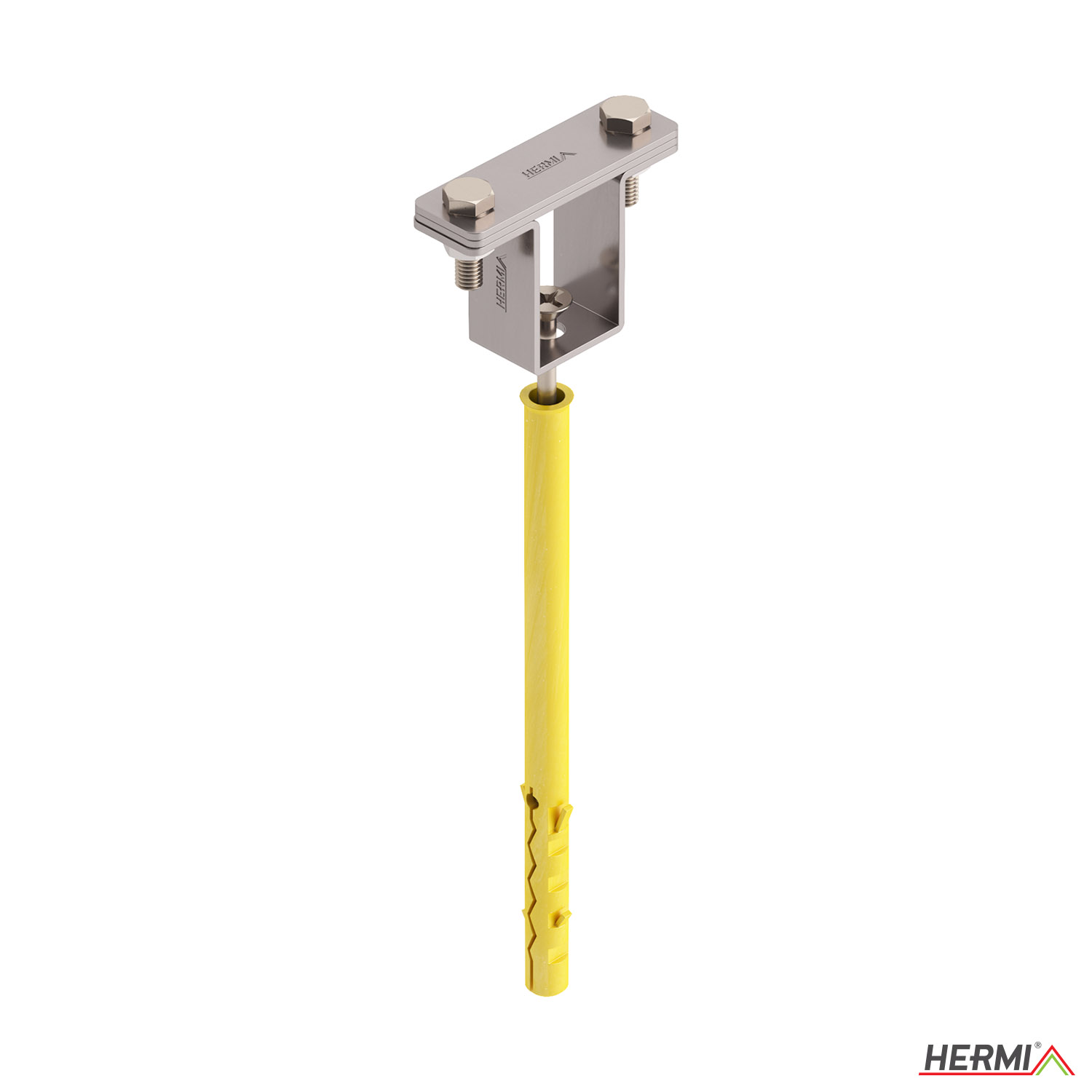 A rozsdamentes acélból készült ZON01 fali vezető tartó 100 mm-es szigetelésű üreges falakhoz, 160 mm-es csavarral és tiplivel, a vezeték a rögzítőhöz csavarozva van .